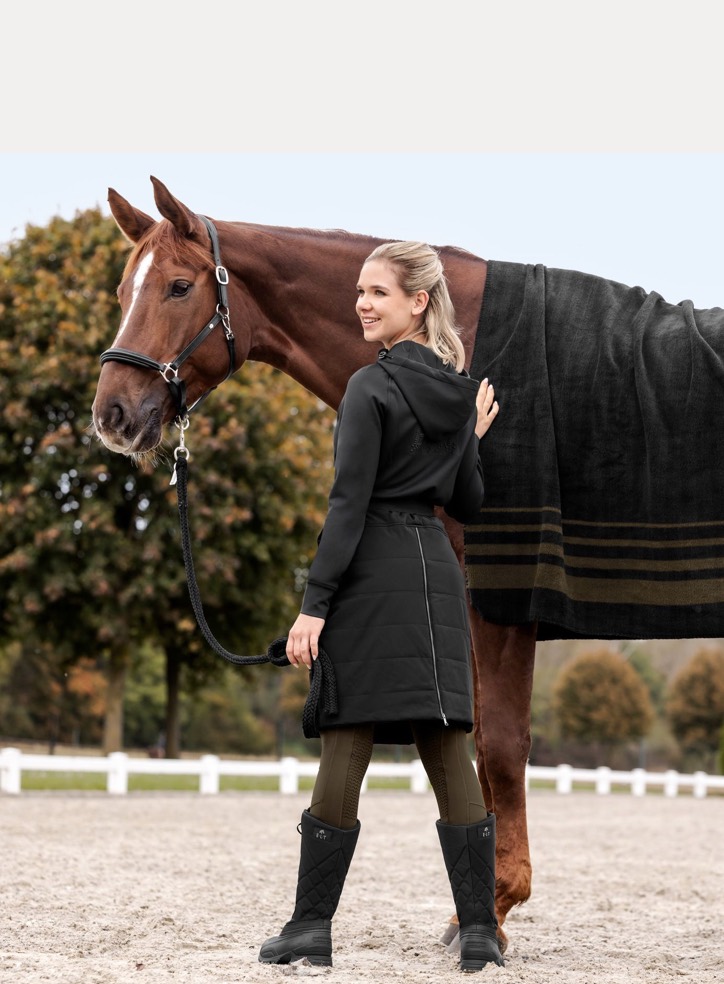 La Gonna Termica Rachel di E·L·T è il prodotto perfetto per affrontare le rigide temperature invernali in sella. Ideale sia per il lavoro in campo che per le passeggiate, manterrà calda l’amazzone senza compromettere il comfort e la mobilità in sella. Perfetta anche per le istruttrici, i groom e i genitori a bordo campo.